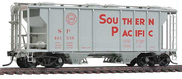 Стандартный двухбункерный крытый хоппер тип PS2. Вагон выпуска 1957 года. Принадлежность Southern Pacific #401338. Вагон с великолепной деталировкой вплоть до открывающихся люков, установленных тормозных шлангов и т.п.