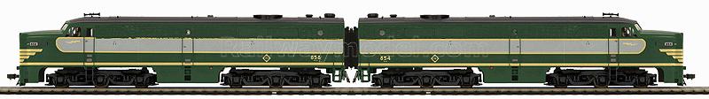 Двухсекционный тепловоз Alco PA-PA, аналоговая версия. Имеется разъем под установку стандартного DCC декодера. В кабине - фигурки машиниста и помощника, свет в прожекторах и номерных таблицах, освещение в кабине. Принадлежность Erie #854 & 858