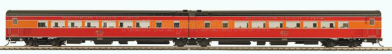 Набор из двух пассажирских вагонов Southern Pacific Daylight ##2458, 2457. Устновлено освещение, металлические поручни, великолепная детализация не только внутри, но и под вагоном. Рекомендуется минимальный радиус 22 дюйма (558,8 мм).
