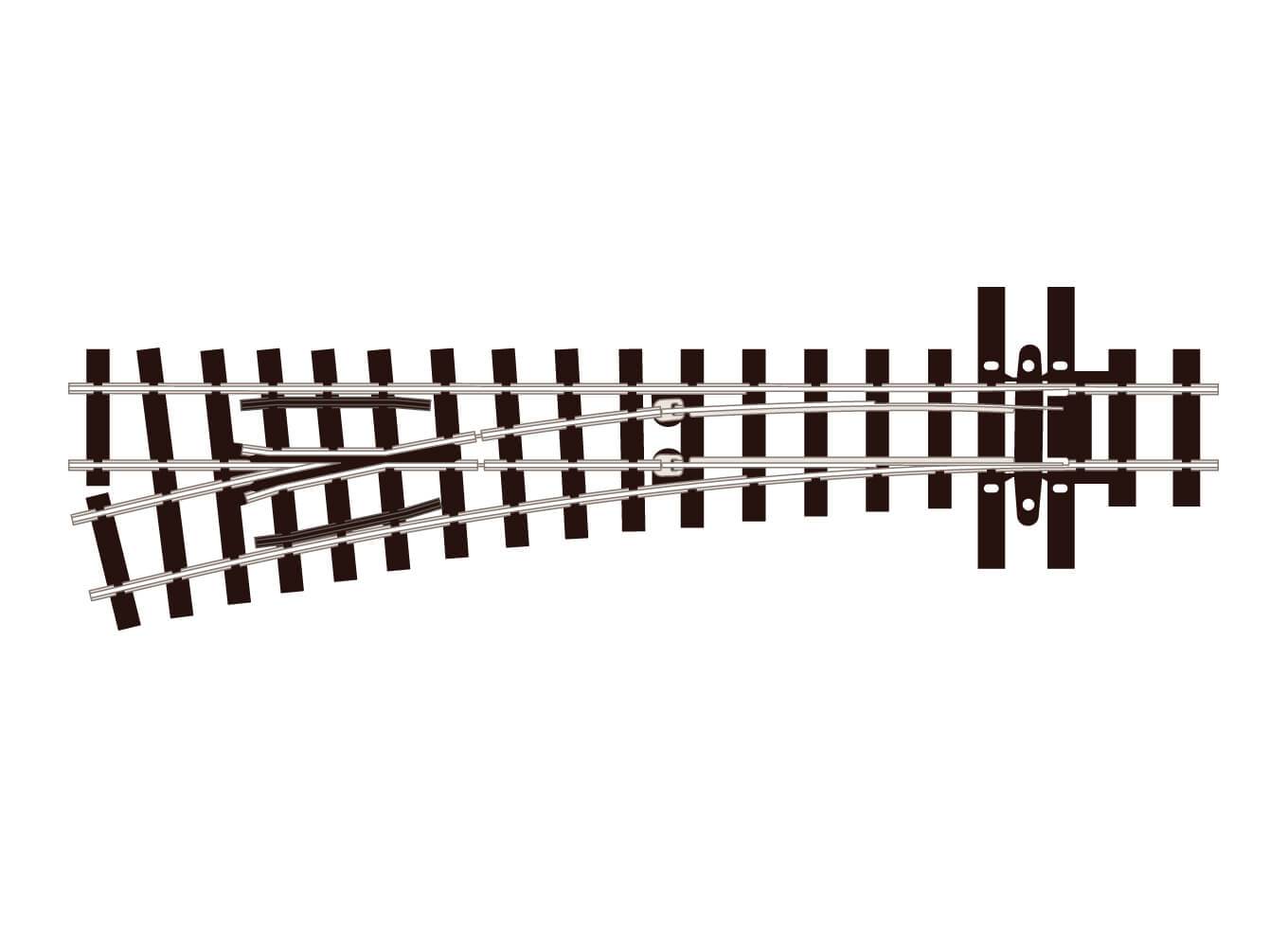 Стрелка узкоколейная левая, радиус 457 мм 14°, длина 143 мм. Совместима с серий PECO OO-9 Setrack. Высота рельса 2,03 мм (код 80).