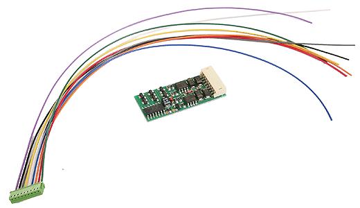 Цифровой декодер NCE D13SRJ, 1,3 А, максимум (пик) 2 А. Сверхплавная работа на медленных скоростях движения локомтива, 4 настраиваемые функции, 15 различных световых эффектов, 9-ти штырьковый разъем. Прилагается также переходник для разъема, с проводами для самостоятельной распайки. Размер платы 37 х 16,5 мм.